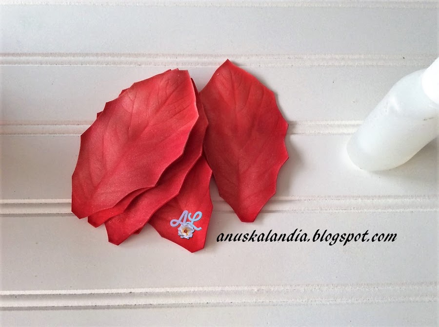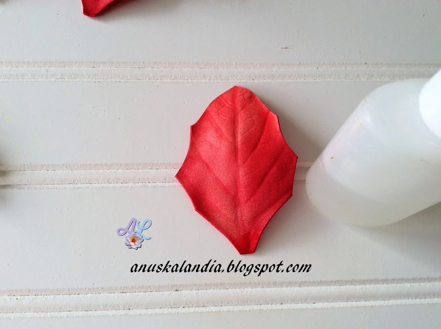 Truco: No hay que olvidar, tanto en pétalos como en hojas, pintar el borde. También se pintarán los dos lados de pétalos y hojas.