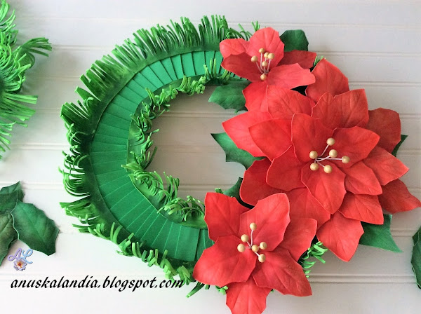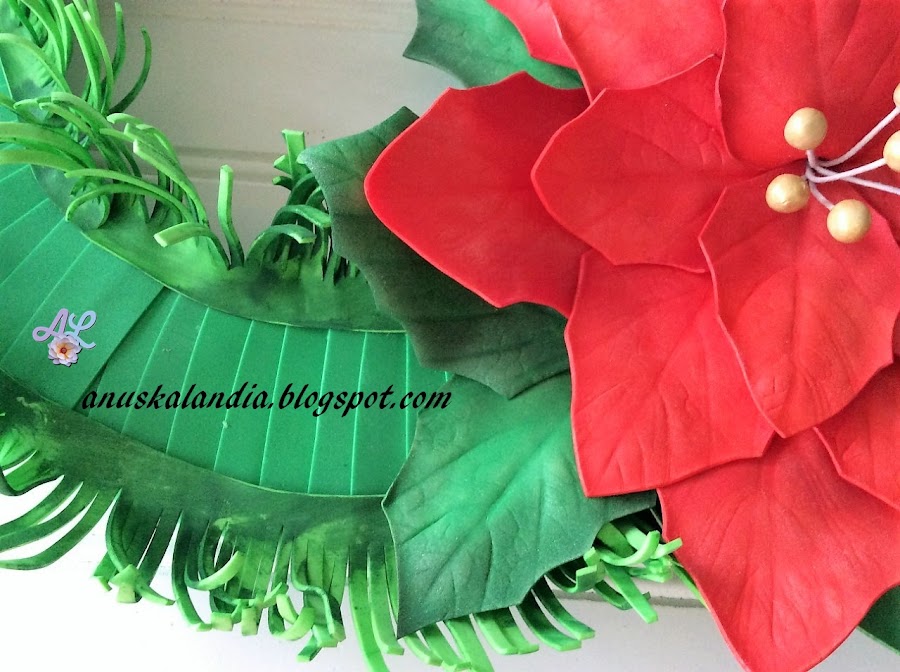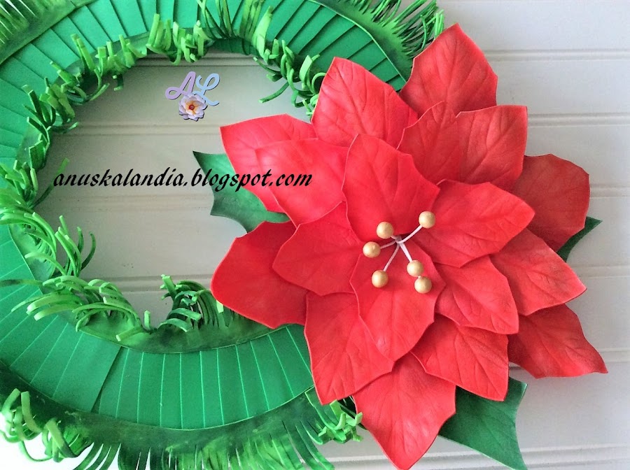 16.- Vamos ya con la decoración de la corona. Tomamos las 3 hojas grandes y las pegamos donde más nos guste. Pegaremos encima la poinsettia grande.