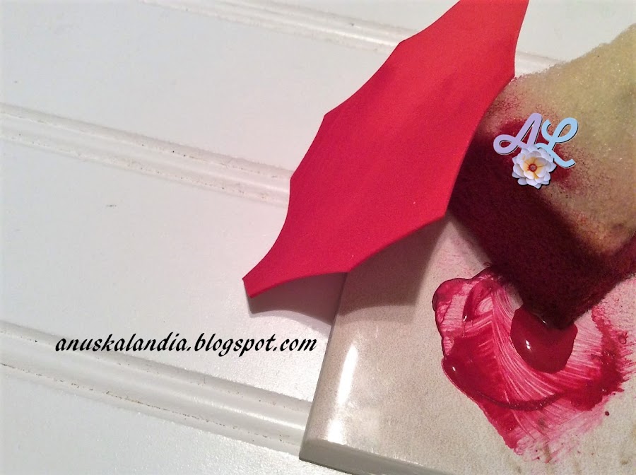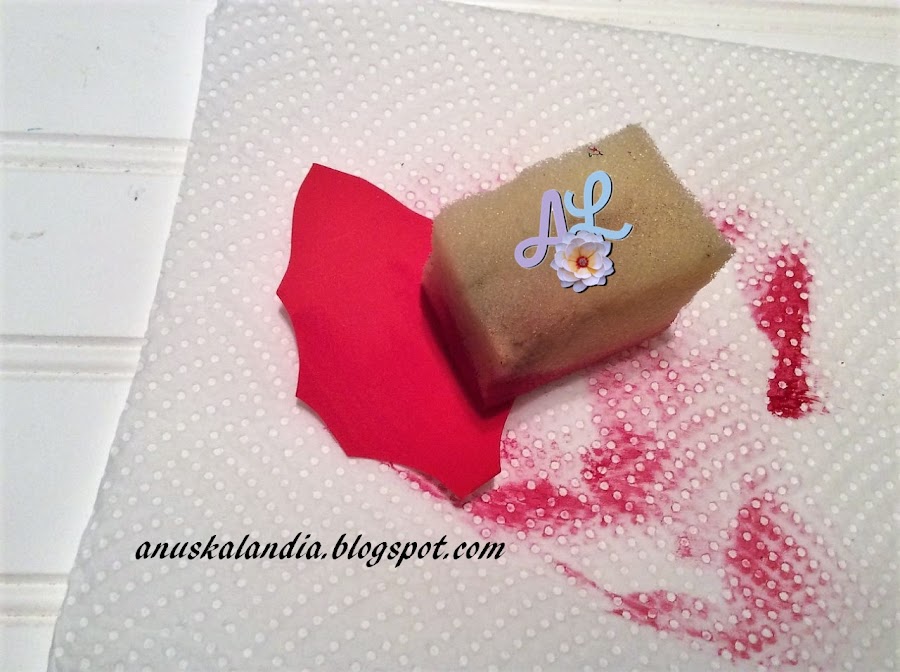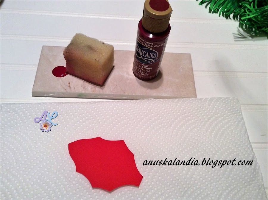 8.- Comenzamos a pintar los pétalos, usaremos acrílica Americana, Rojo de Alisarin, esponja, mi querido amigo el rodapié. Debajo de la pieza a pintar, pondremos papel de cocina para no manchar.