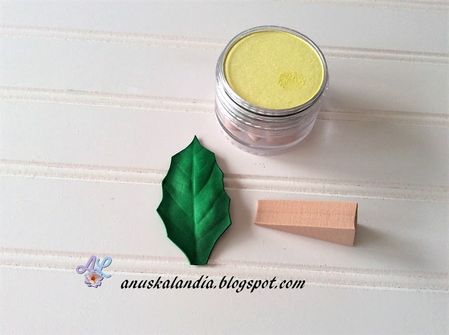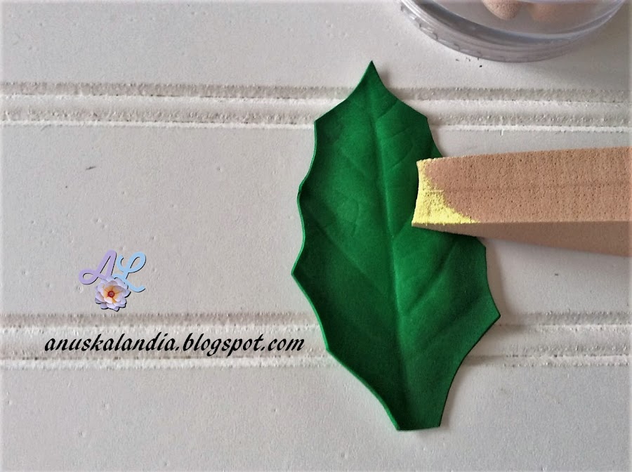 Cogemos un poquito, con la punta de la esponja, y pasamos por las hojas y los pétalos, por el lado que están marcadas las nervaduras.