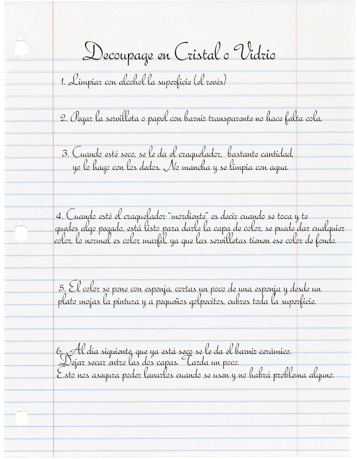 Bueno, espero que os haya gustado y que os animéis a hacer alguno, en caso de no querer hacer toda la vajilla completa. Pero una vajilla de 6 platos no es mucho trabajo y se hace rápido, recomiendo hacer los seis a la vez. Por cierto estos platos de cristal se venden aproximadamente por 1,10 â?¬ el plato grande, 0,70 el plato del pan y 0,30 el de apoyar el cubierto.