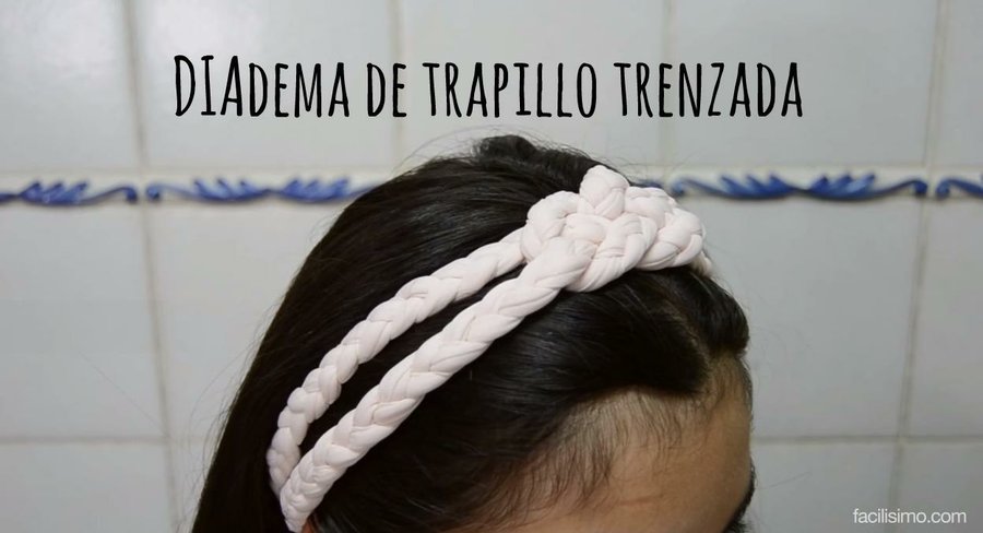 El segundo diseño de diadema consiste en el mismo nudo, pero esta vez, en lugar de utilizar las tiras de trapillo simples, previamente se han trenzado. Entonces, el nudo deberás de hacerlo con dos trenzas sencillas de tres cabos. ¡La técnica es la misma!