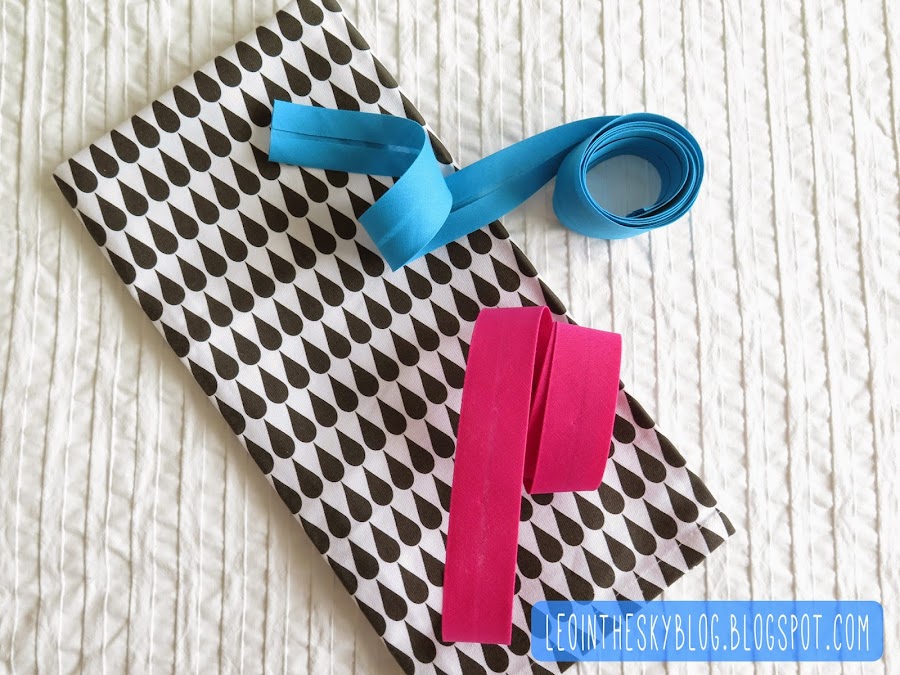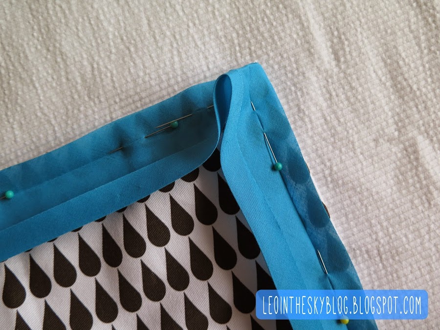 Se coloca la cinta bies con unos alfileres y se cose a máquina. Para hacer las esquinas miré tutoriales en internet para saber cómo coser correctamente esta cinta, que yo antes cosía a las bravas y ya aprendí que no, que primero se cose un lado y luego se hace el otro tapando la costura del lado anterior...