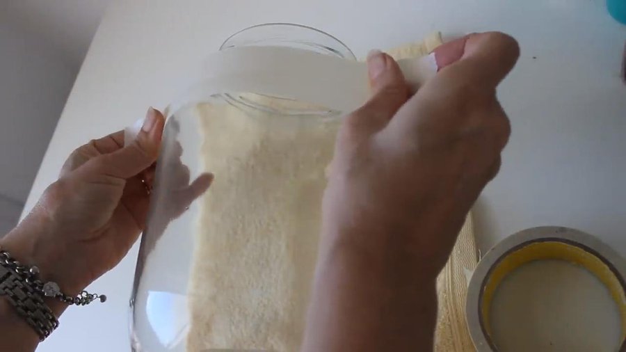 después cerraremos los laterales para formar en el centro una especie de etiqueta, para eso colocaremos dos trozos de cinta de manera diagonal a ambos lados.