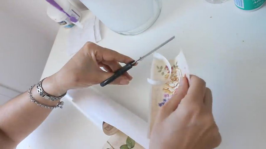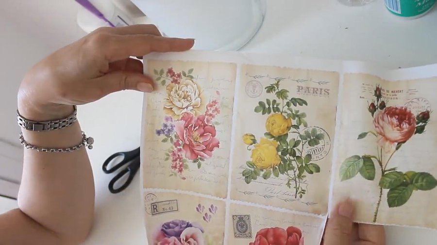 Como les decía anteriormente vamos a acompañar esta bonita técnica con otra conocida con el nombre de decoupage. Para realizarla podemos utilizar servilletas decoradas o como en este caso imágenes de papel para decoupage (también podría ser con papel de regalo o inclusive tela).