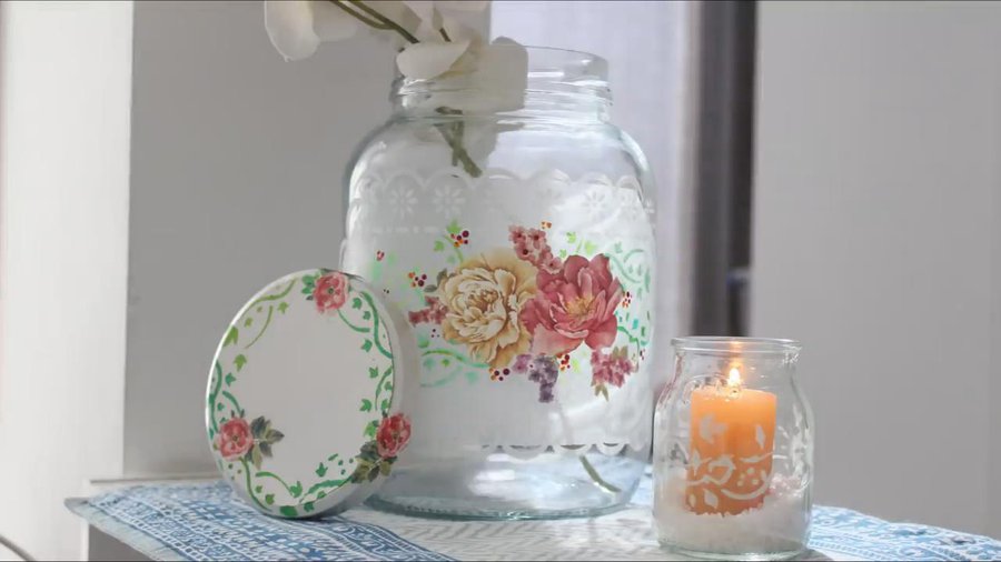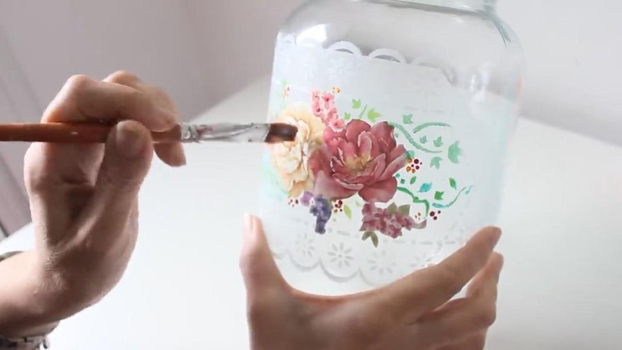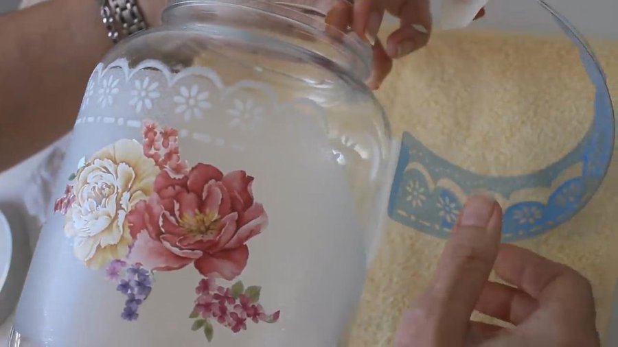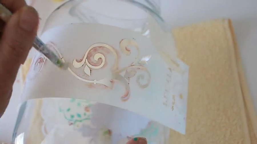 En la parte posterior del frasco con otro stencil haremos la misma técnica de esmerilado utilizando solamente el barniz mate para que quede como una especie de grabado.