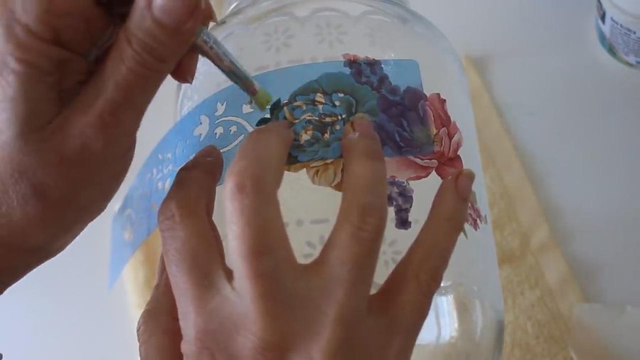 Para aplicar la mezcla de barniz y pintura utilizaremos un pincel taponador, en caso de que no tengan pueden usar un pincel chato de cerdas duras. Es indispensable cargar la pintura en el pincel y descargarla bastante sobre una servilleta de papel o un papel absorbente (puede ser papel higiénico). Al stencil lo debemos realizar con el pincel con el mínimo de carga de pintura.
