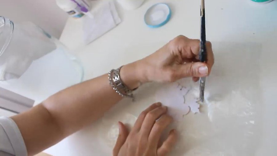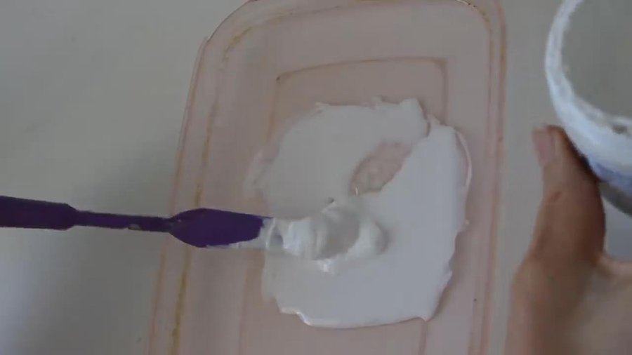 Para el siguiente paso vamos a preparar un mezcla del mismo barniz y pintura acrílica blanca. La proporción es aproximada pero la cantidad de barniz debe ser la más abundante. La pintura será a penas una pizca (el 10% del la cantidad de barniz más o menos).