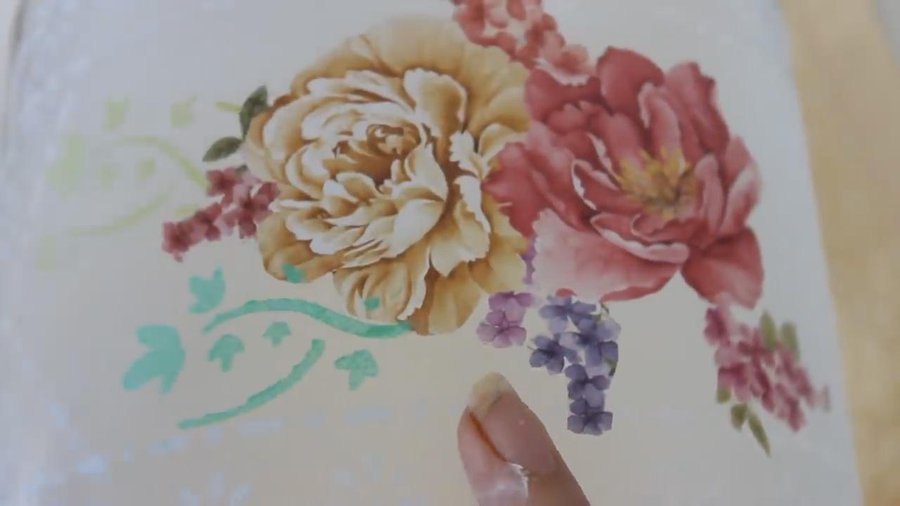 Para completar el diseño de las flores utilizaremos un stencil de hojas y pintura acrílica en distintos tonos de verdes,