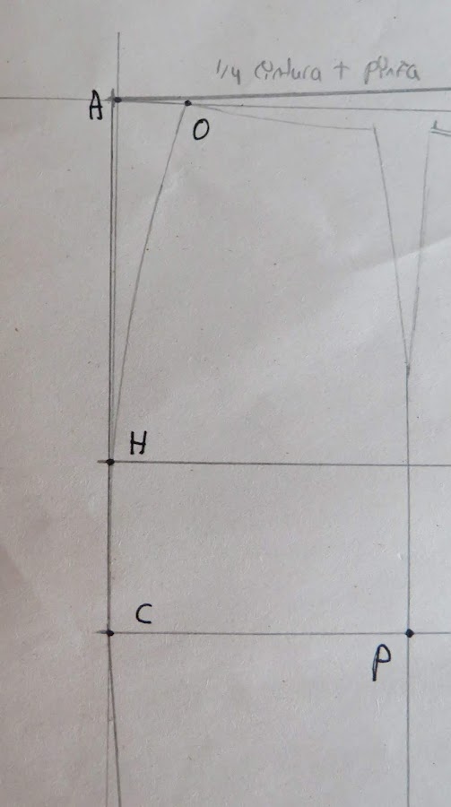 Llevamos una línea recta desde Ñ, con la medida de 1/4 contorno de cintura + 3 cm de pinza, que corte sobre la linea de cintura