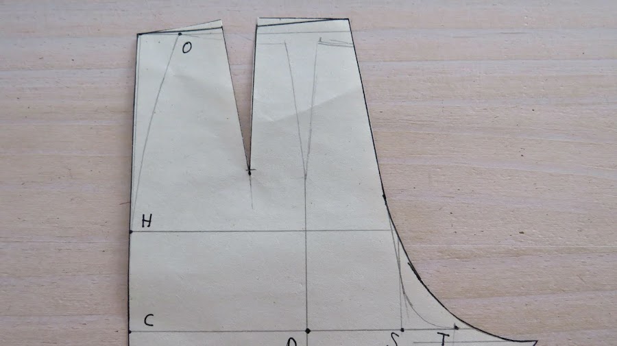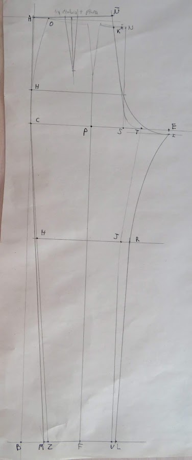 Observa que en el patrón de la espalda vuelven a repetirse las letras del delantero, porque partimos del mismo patrón, y es necesario dibujar las líneas a lápiz, muy suave, de éste, para continuar haciendo el patrón espalda