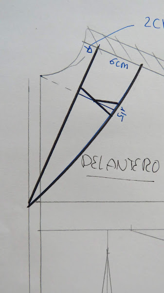 Desde la línea inferior de la pinza, alargamos hasta la linea que hicimos de escote en pico