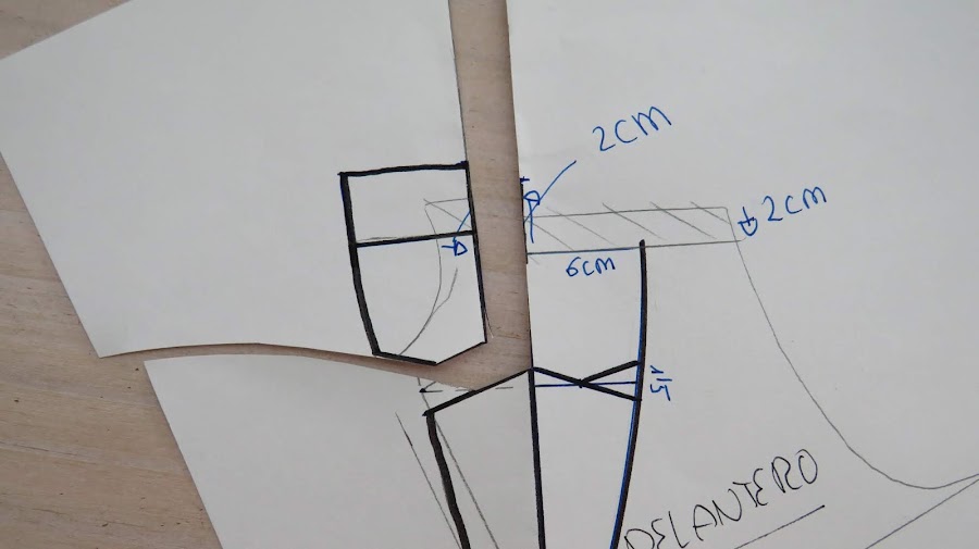 Empezamos a dibujar la forma de la solapa directamente sobre el patrón, como si estuviera ya acabado, para ver como quedaría