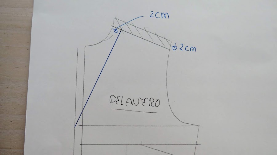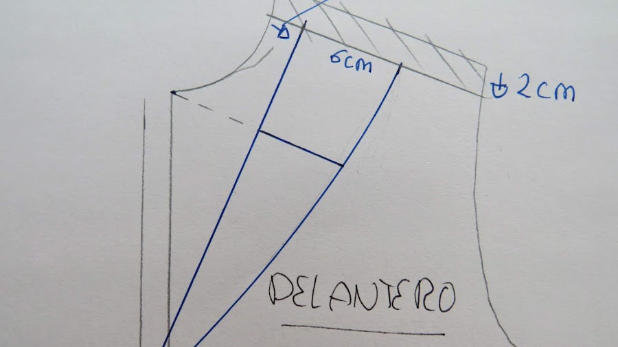 Dibujamos una línea ligeramente curva desde el punto donde marcamos los 6 cm hasta el punto donde acaba el escote que corta con el cruce