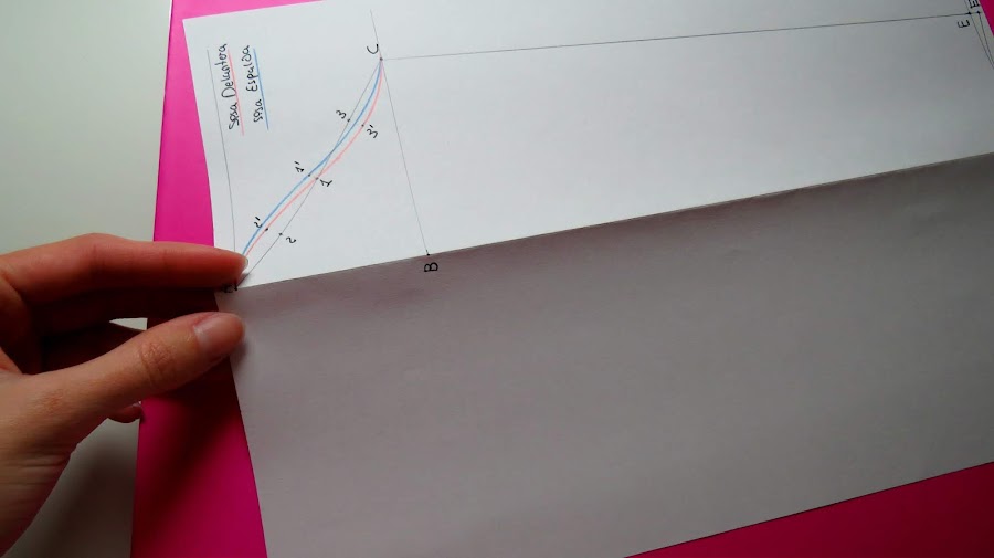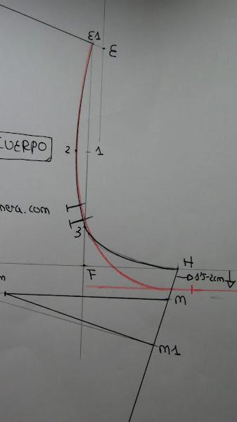 Una vez lleguemos al punto E1 de la sisa de la blusa, nos detenemos, y marcamos ese punto en la zona de la copa donde haya quedado. Da igual si se ha pasado del centro de la manga, esa es la idea, ver el centro real de la copa