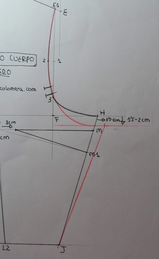 Desde la línea de sisa, bajamos de 1,5 cm a 2 cm. Ya iremos viendo más tarde, cómo esta medida depende de la prenda que estemos haciendo.