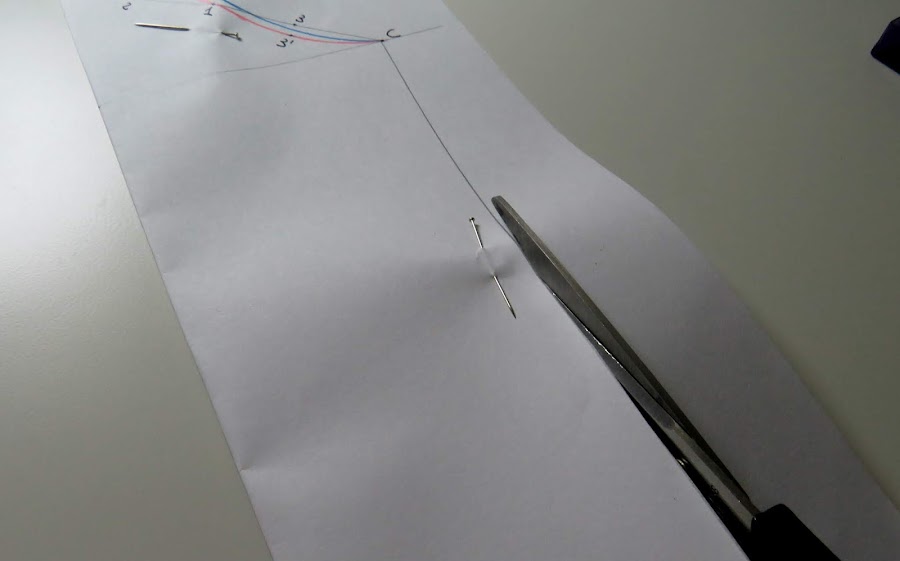 Trazamos una línea indefinida, que nos servirá de apoyo para trazar la nueva sisa (línea roja)