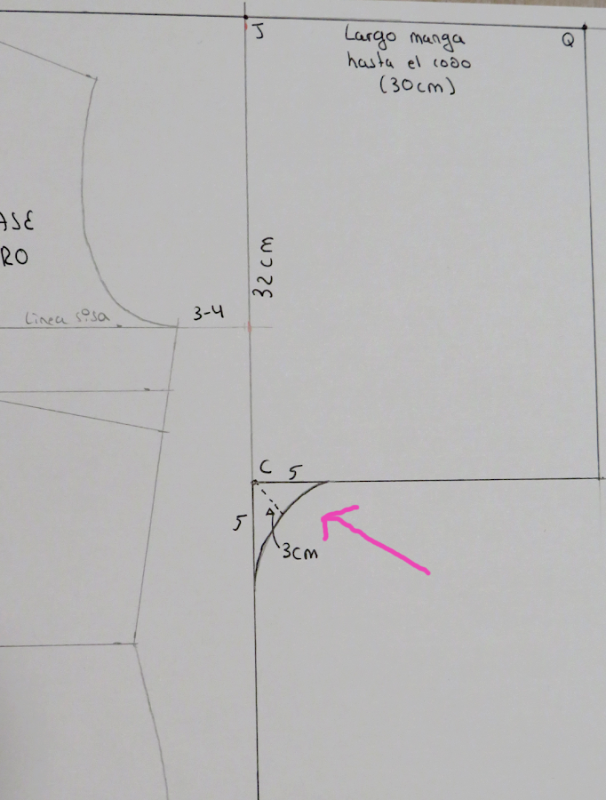 No tiene una medida exacta, la trazamos de forma indefinida, cuánto más larga mejor, así no nos faltará para marcar el largo de manga