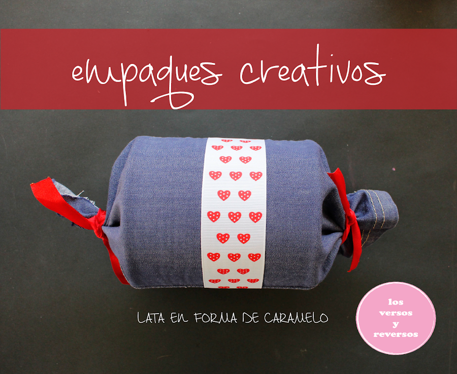 Para este empaque utilizamos una lata, un sobrante de tela de la pierna de un pantalón de mezclilla infantil, listón para decorar con corazones y dos listones rojos, pegamento blanco o silicón caliente. Forra la lata con el sobrante de tela. Cierra los extremos con los listones y pega con el silicón caliente la cinta de decorada al centro de la lata y listo!!