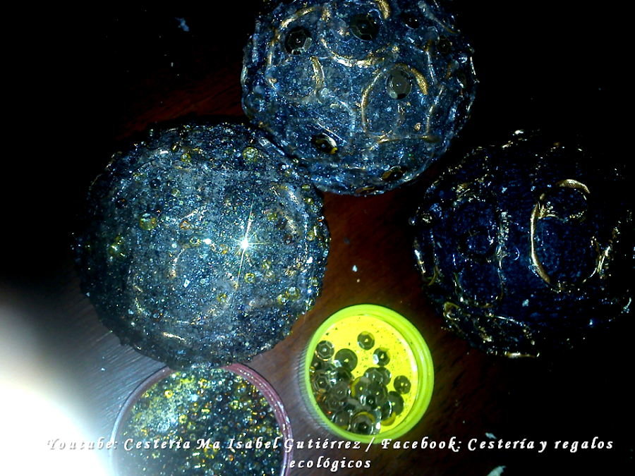 Con la pistola de silicón hacemos algunos relieves alrededor de las esferas...