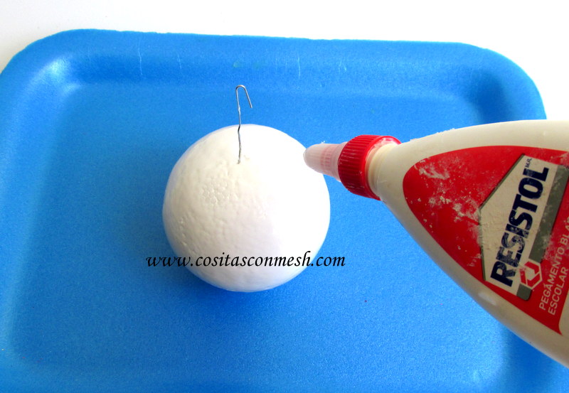 2.- Ahora vamos a poner en toda la esfera pegamento blanco, deja que quede bien cubierto de pegamento para que la diamantina pueda coger fácilmente. 3.-Muy importante, usa un plato desechable o papel periódico, ya que vamos a rociar toda la esfera de unicel con la diamantina, asi no desperdiciamos nada de la diamantina y volvemos a usar lo que quede en el plato.