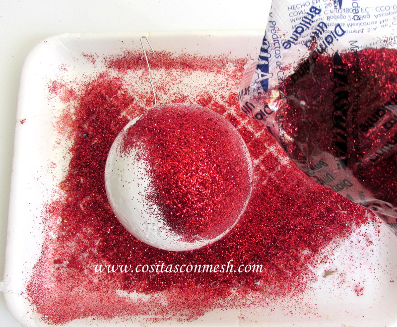 4.-Es importante que dejes secar bien la diamantina sobre la esfera, ya que para hacer el diseño del copo de nieve vamos a manipular la esfera, y si esta no esta bien seca, se desprenderá la diamantina.