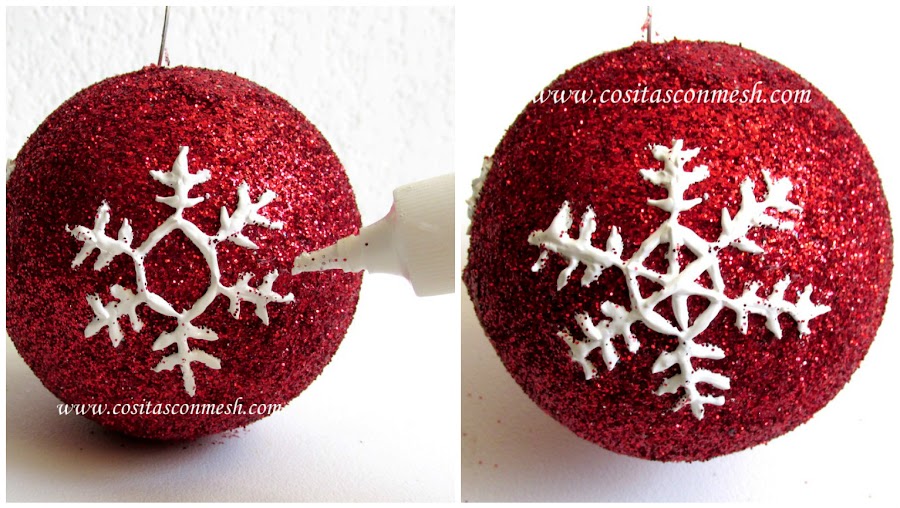 ** Usa pintura de relieve color blanco, y procede a delinear un hexágono, a partir de ahí dibujaremos el copo de nieve. 5.-Terminamos de hacer el diseño del copo de nieve, esta pintura al ser más espesa y como el frasco tiene boquilla, es más fácil hacer este tipo de diseño, pero si aun así temes no poder hacerlo, te recomiendo practicar en una hoja de papel.