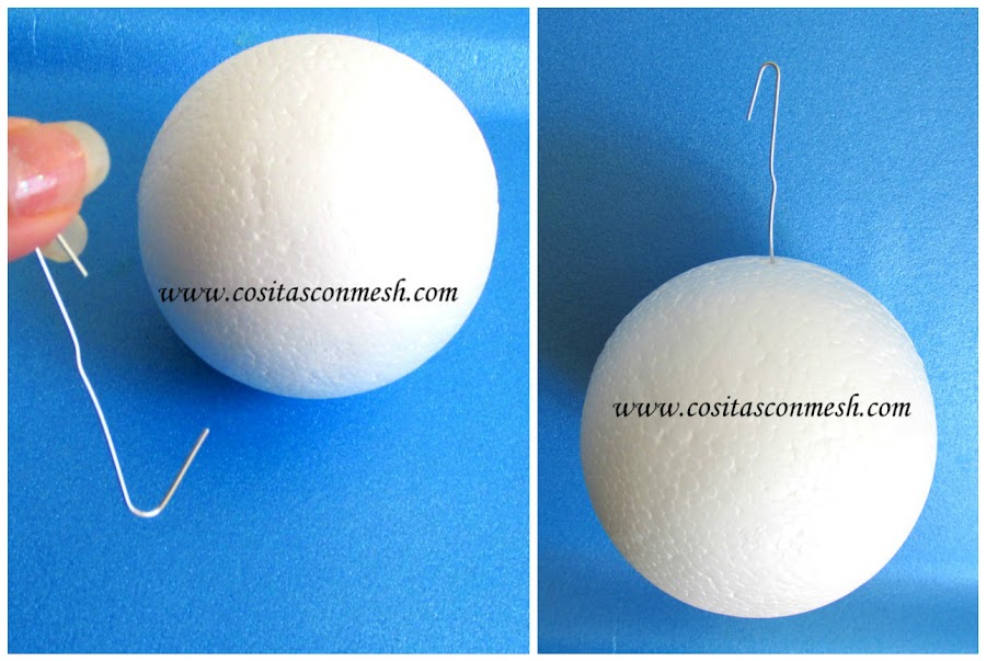 Antes de comenzar a decorar la esfera de unicel, vamos a hacer un ganchito para colgar nuestra esfera cuando ya este decorada. Vamos a coger un clip o un alambrito y lo metemos en la parte central de la esfera (checa la foto ).