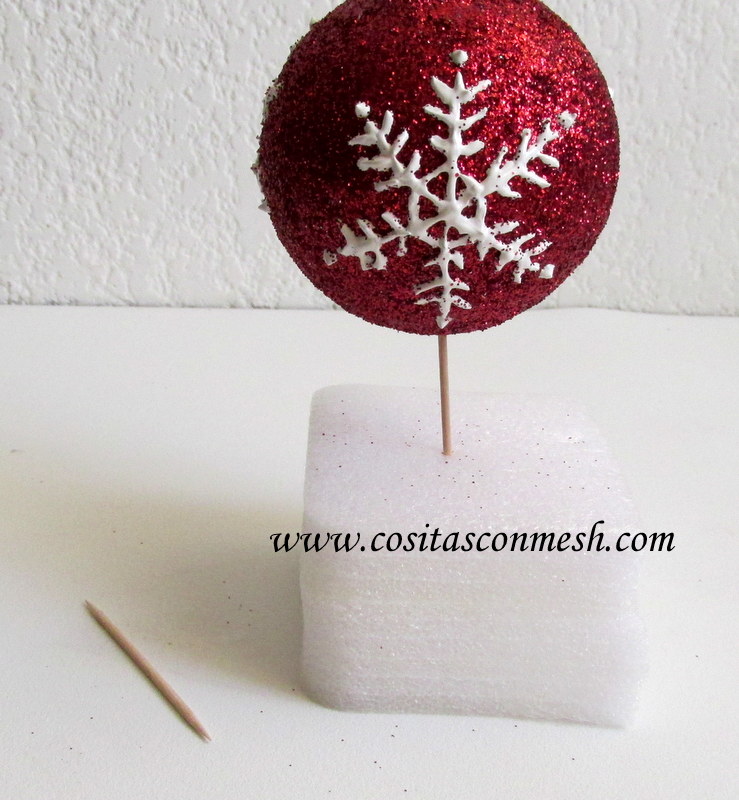6.-Como te decía en el paso anterior, usa una base de unicel para prender en el las esferas y así dejarlas secar o empezar a decorarlas, esto facilita mucho el trabajo.Luego de que las esferas estén bien secas procedemos a hacer unos moñitos para decorarlas y eso es todo :).