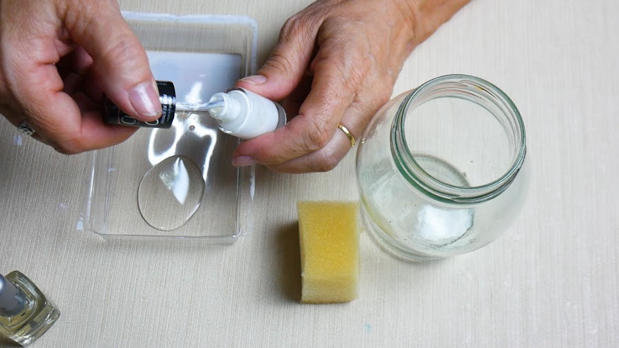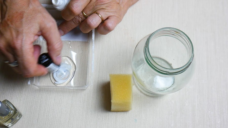 Una de ellas es directamente esmalte nacarado blanco, lo podemos colocar en un recipiente o directamente con el frasco sobre el trozo de esponja y con golpecitos lo aplicamos alrededor, lo hacemos hasta que comience a secar y los golpecitos achiquen el esmerilado y quede bien parejo.