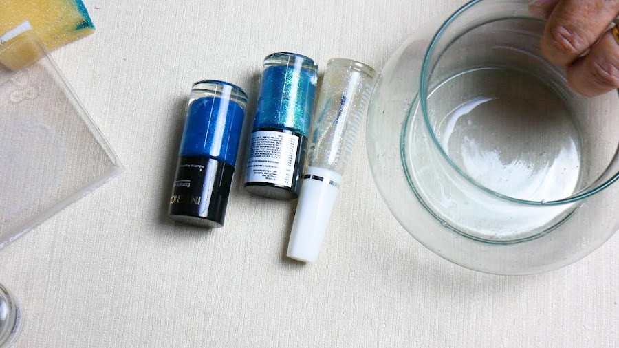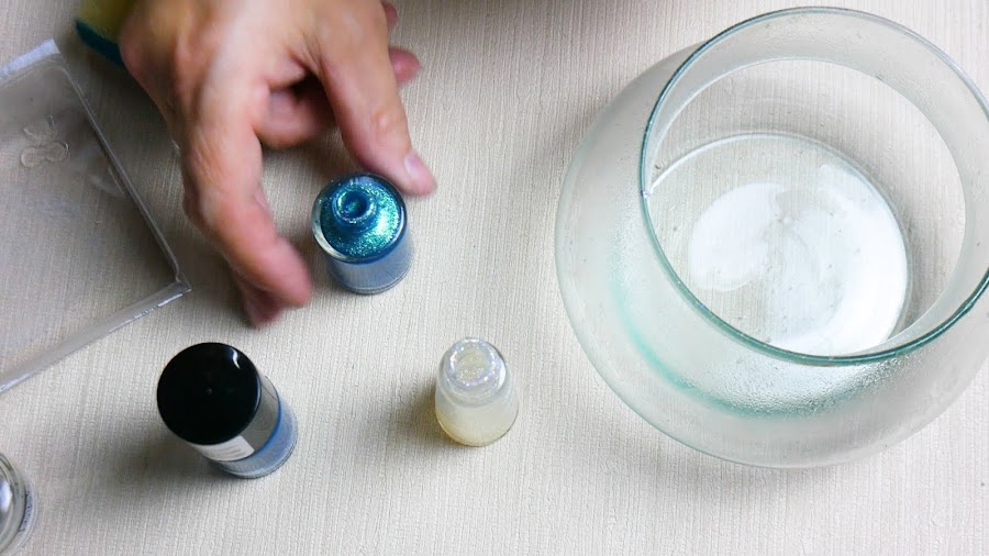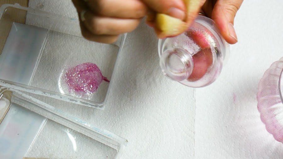 Aquí el cambio es el siguiente, coloco los colores de a uno en un recipiente y a cada uno le agrego brillo de uñas con dos finalidades: