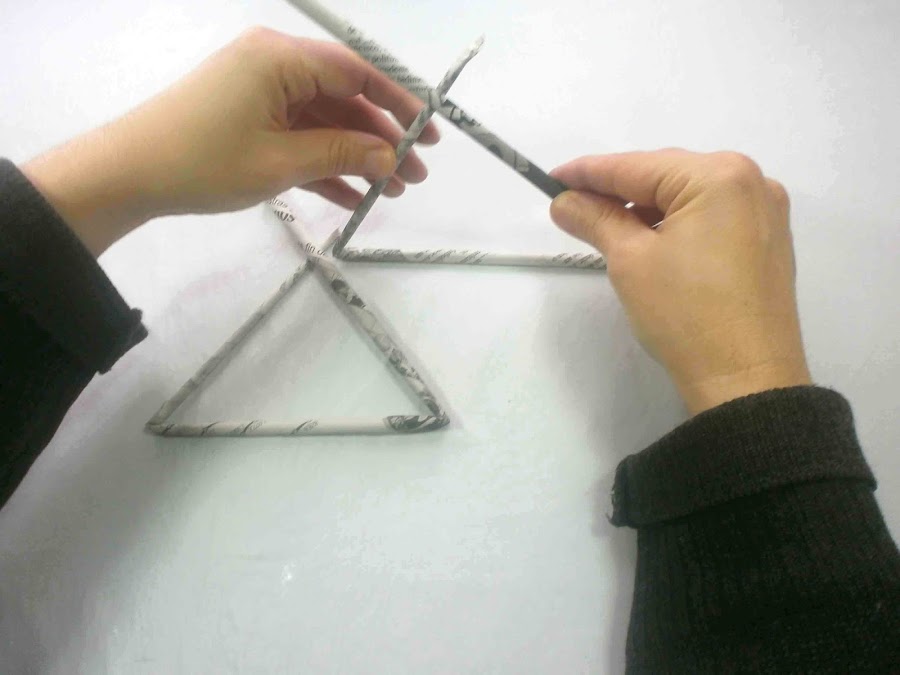 Se toman dos varitas de periódico. Se doblan en dos partes para formar dos triángulos del mismo tamaño.
