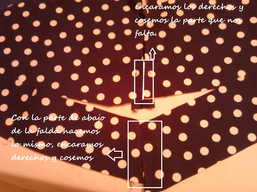 3.-Encaramos los derechos de la parte que falta y cosemos. Con la parte de abajo de la falda hacemos los mismo, encaramos derechos y cosemos. Solo cosemos un costado para que nos sea más fácil coser los volantes.