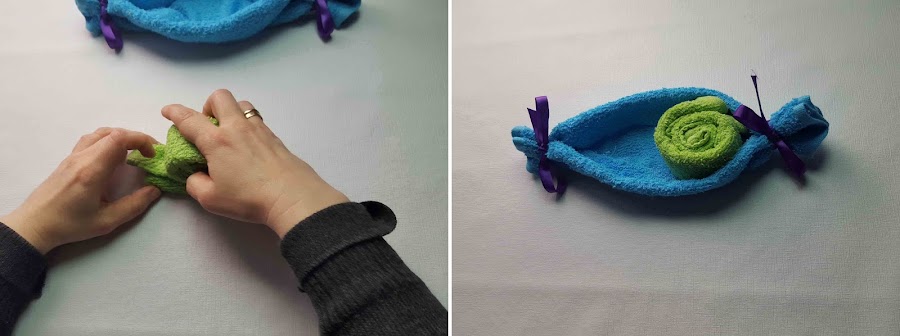 Y para el búho se enrolla la toalla empezando por una esquina, se dobla al medio hacia arriba para después hacer las dobleces hacia abajo. Se le coloca una goma para sujetar, un lazo, dos círculos de fieltro y encima unos ojos de plástico. Para el pico se le pone un trozo de fieltro amarillo cortado en forma de pico.