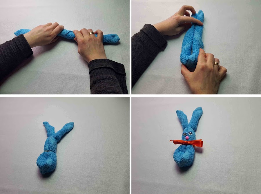 Para hacer el conejito, se enrolla la toalla y se dobla hacia arriba, se colocan dos gomas, el lazo, los ojos y la nariz.