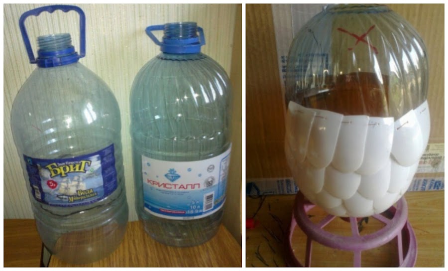 1.- Según el tamaño del animalito que quieras hacer, usa botellas grandes o pequeñas. En este caso se usan botellas de 10 litros para hacer el cuerpo del lorito, corta el pico de la botella para comenzar.