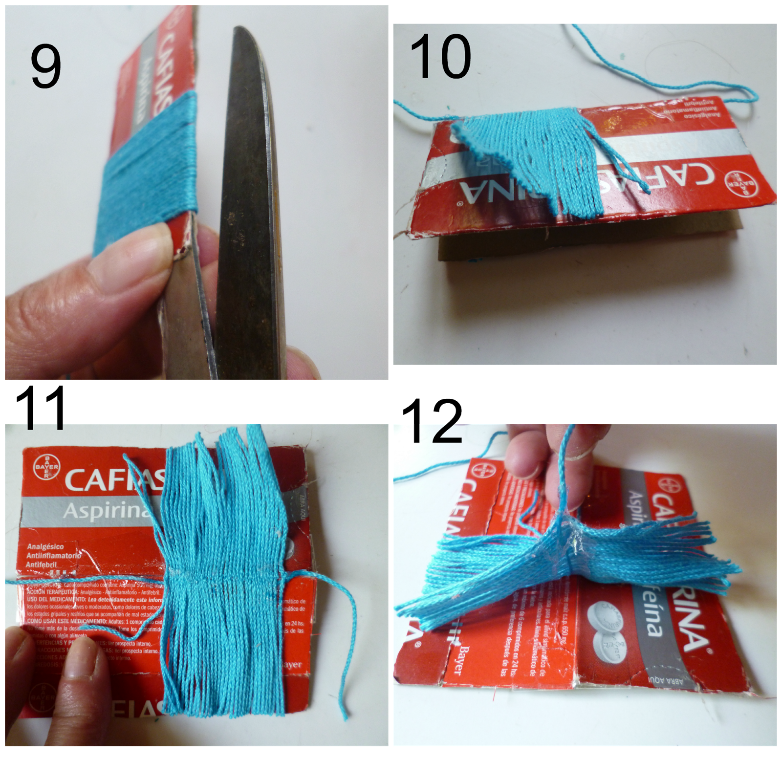 9 y 10 -Meter la tijera por el lado abierto del cartón y cortar el hilo.