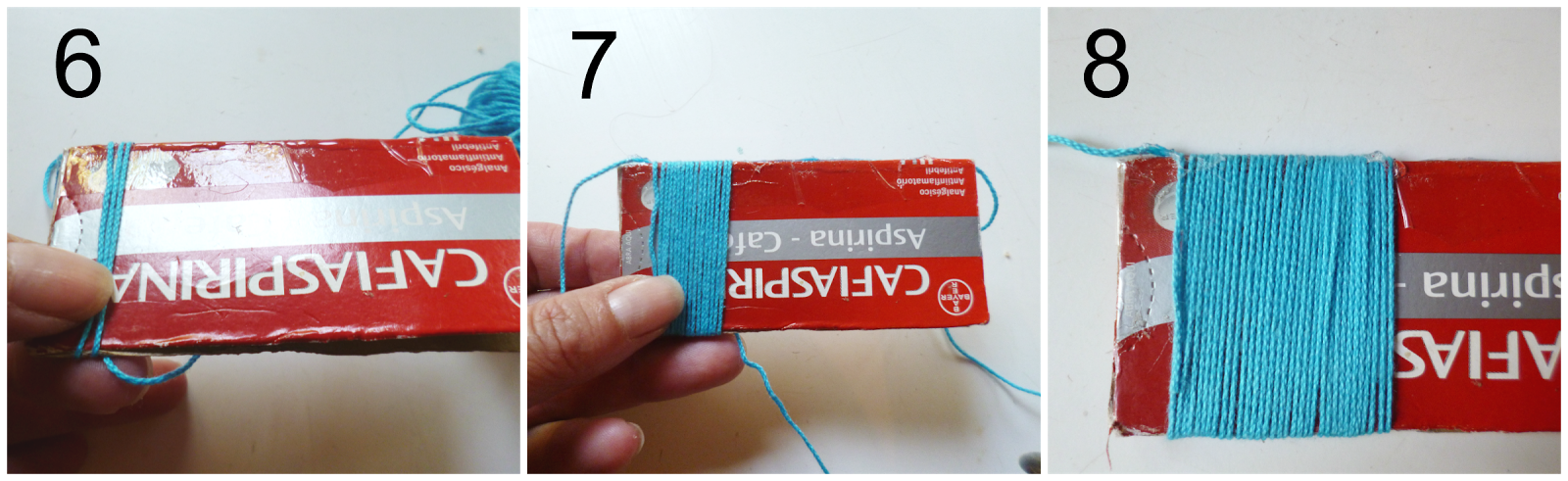 6 y 7-Empezar a enroscar el hilo rodeando el ancho del cartón,este ancho nos determinará el largo de los flecos.