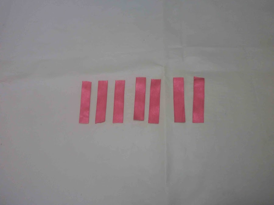 Silicona calienteSe cortan siete tiras de cinta. La cinta que yo he usado mide 1 cm aproximadamente de ancho y las he cortado a la medida de 7 cm de larga.