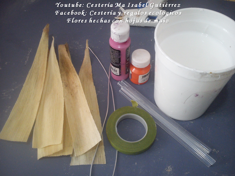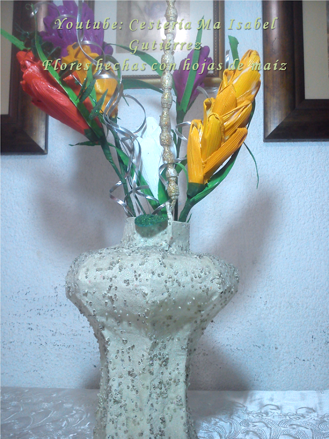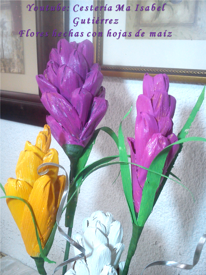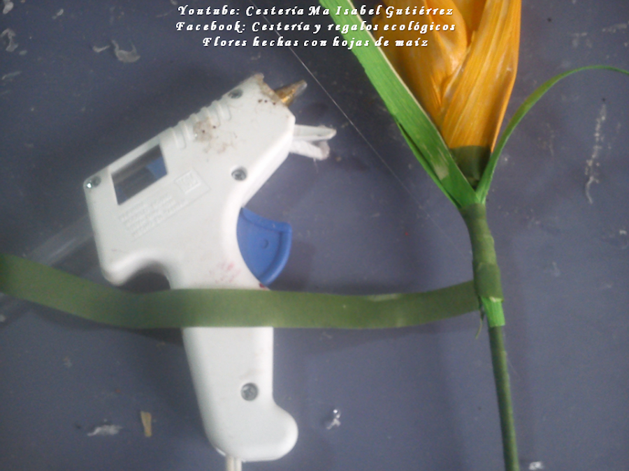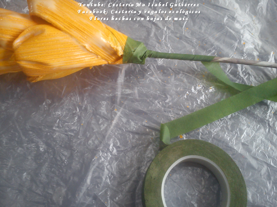Podemos pegar en el tallo, hojas alargadas que hacemos cortando tiras largas de hojas de maíz, pintamos y listo, por último volvemos a poner un poco de cinta para tallos para cubrir esta unión...