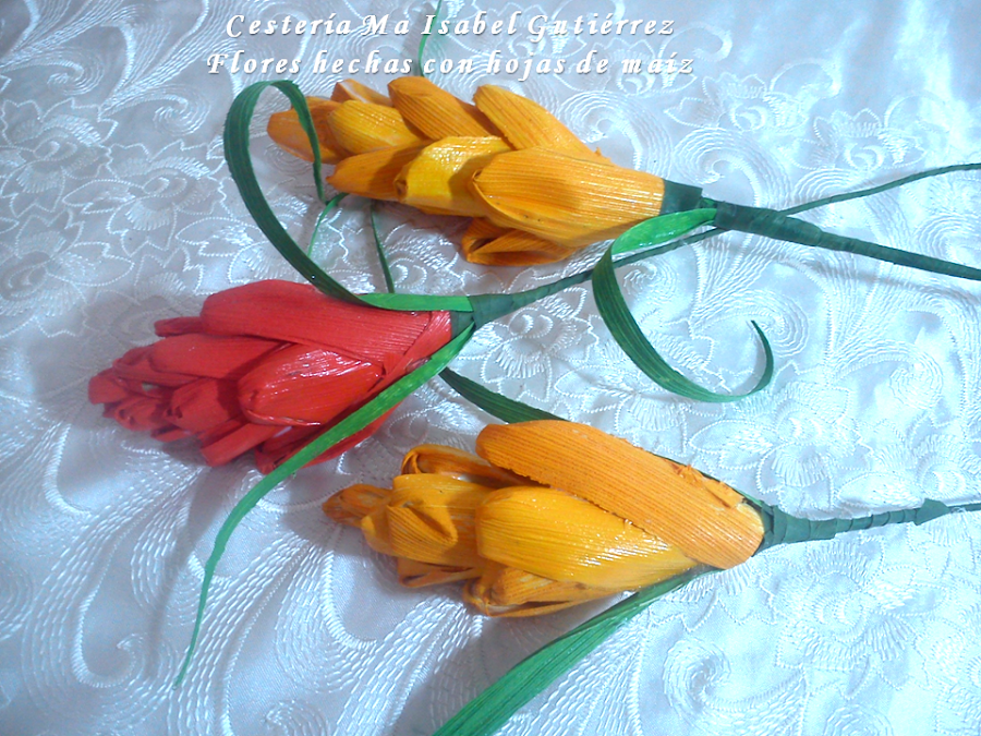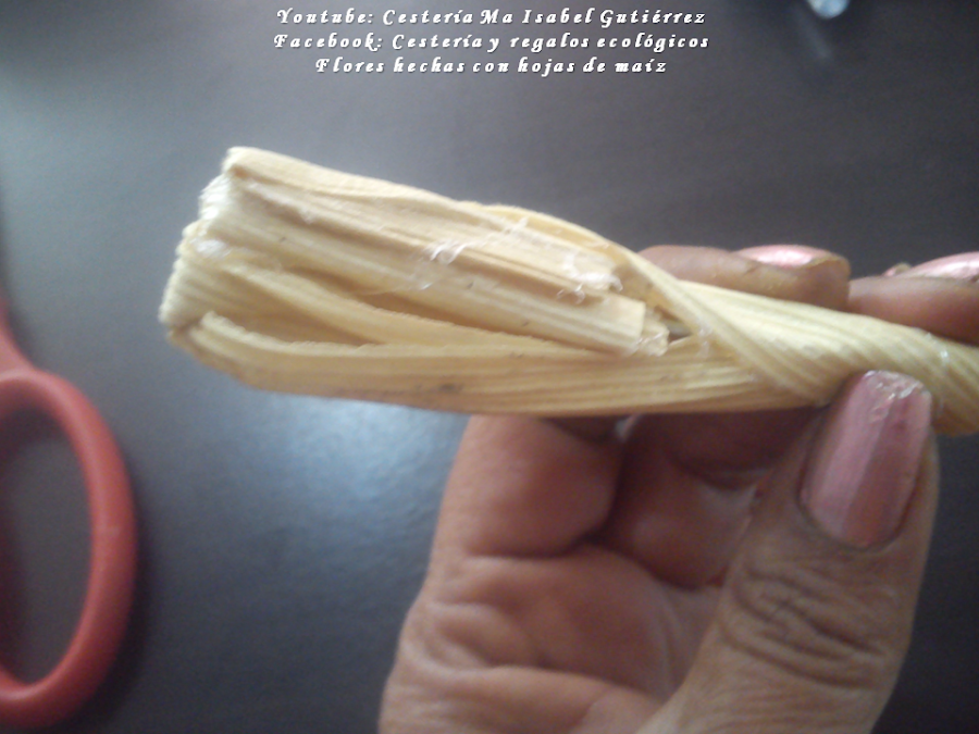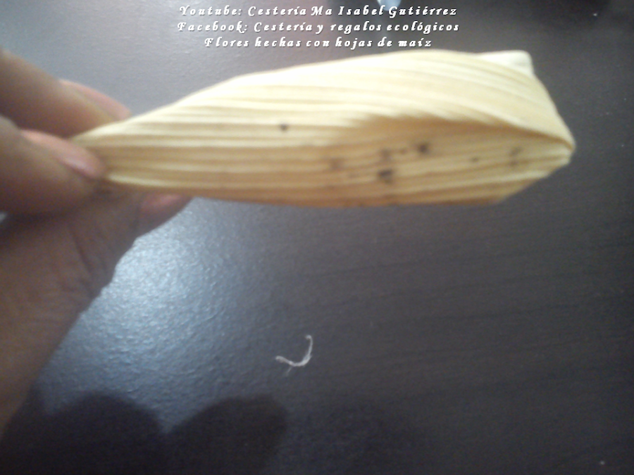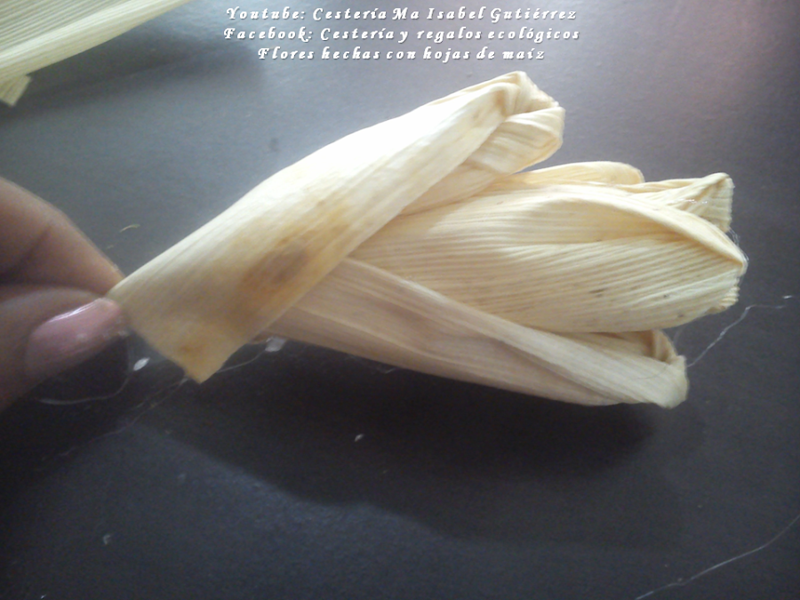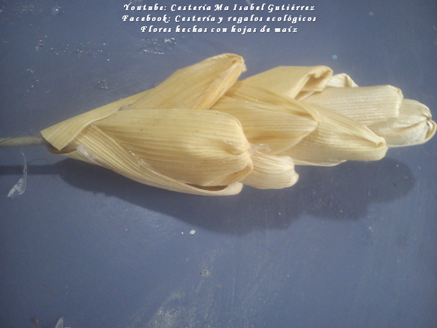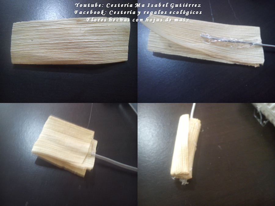 Para hacer el centro de la flor, primero cortamos un rectángulo de hoja de maíz de aproximadamente 10 x 5 cms., lo doblamos a lo largo y pegamos el alambre a mediación, como se ve en la imagen, doblamos la parte de arriba y pegamos, luego enrollamos sobre el alambre...