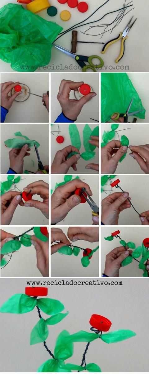 Necesitaremos tapones de colores para las flores, y bolsas de plástico de color verde para las hojas. Para el tallo y las ramas utilizaremos alambre de color verde de dos espesores diferentes.