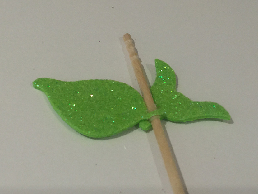 En los palitos de madera, pegamos las hojas de Goma Eva.