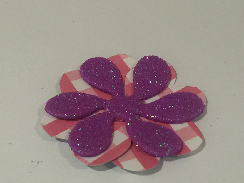 Por encima de la flor de cartulina, pegamos una flor de Goma Eva.