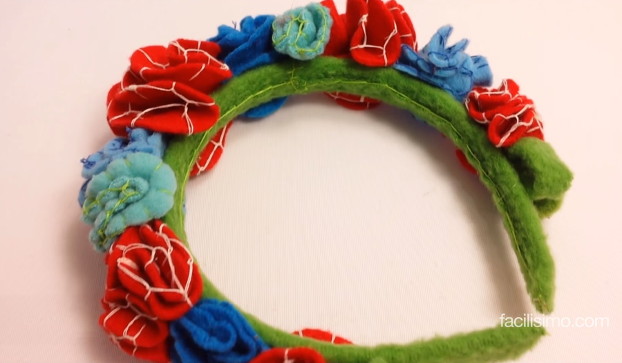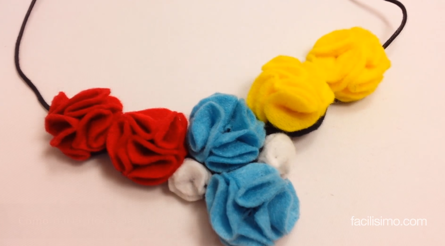 Esta flor con relieve dará un toque de color a tus complementos, como puedes ver en el siguiente collar o, también, en la diadema. Los materiales que necesitarás son: