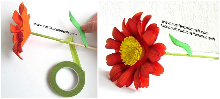 15.-Para forrar el palito (brocheta) uso flora tape verde, lo voy poniendo poco a poco y uno la hoja al palito, pegándolo con el flora tape.