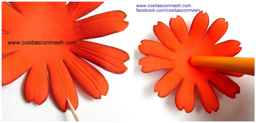 6.-Inmediatamente con un palillo finito (un mondadientes) hago lineas finitas en cada pétalo.