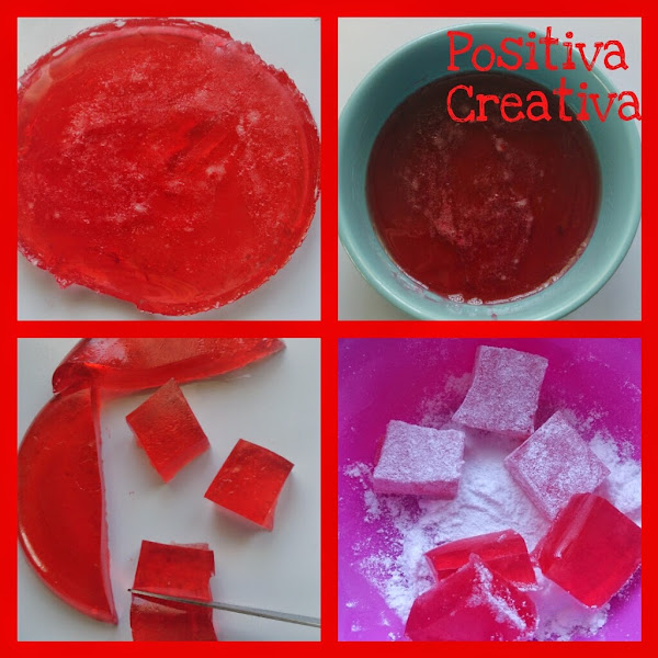 Otra idea para aprovechar la gelatina es llenar unos moldes platos y una vez hayan reposado durente 10 horas, se desmolda y se cortan en cuadrados y por último se rebozan en azúcar glass.