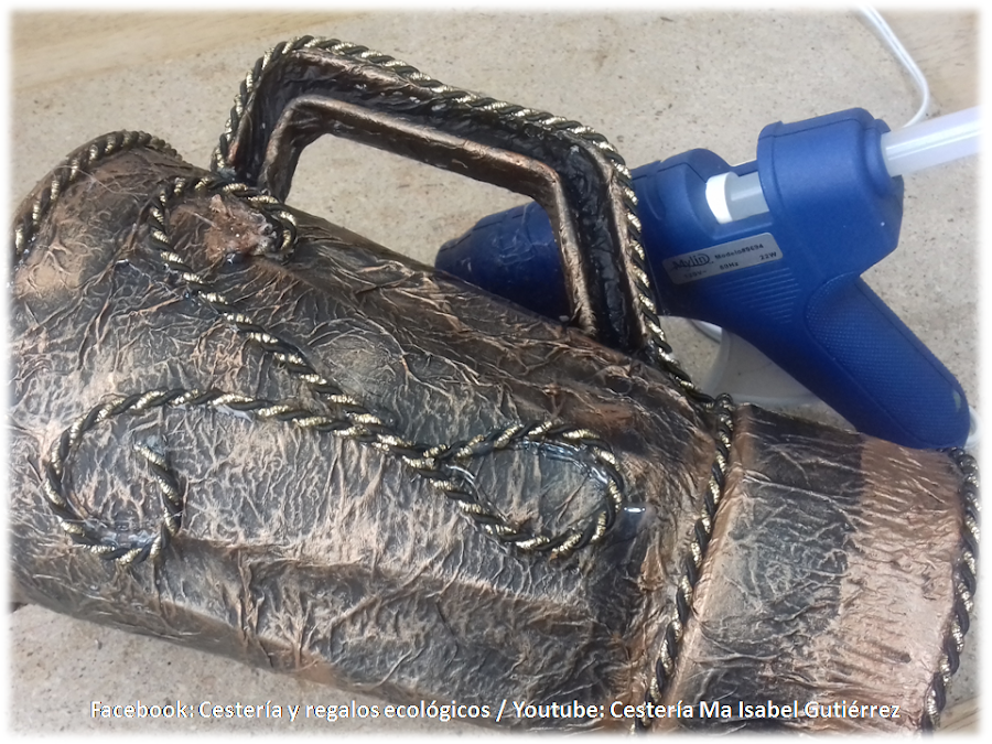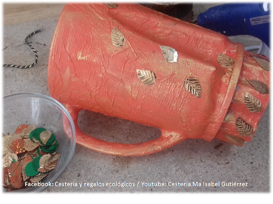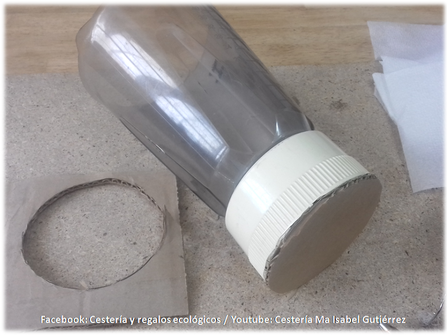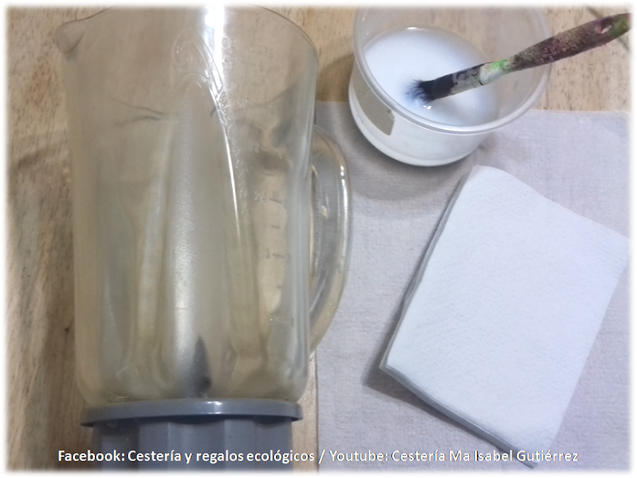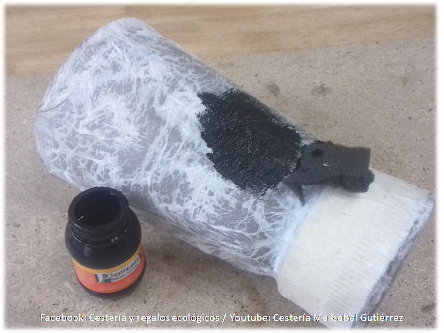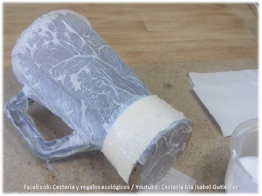 Ahora vamos a pegar alrededor y por la parte de abajo, servilletas o papel higiénico con una mezcla aguada de pegamento o cola blanca común y agua. Cuando seque la primera capa, aplicamos una segunda, lo que buscamos es una textura arrugada, con relieves...