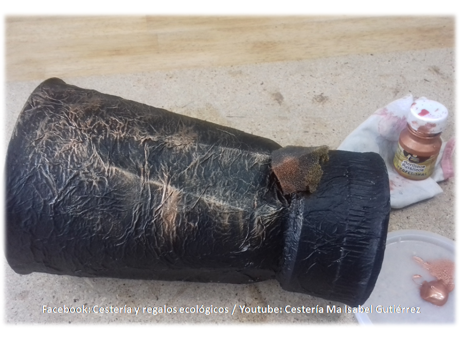 Ya que esté seca la pintura base, con un pedazo de esponja, aplicamos una mínima cantidad de pintura acrílica metálica en color bronce, antes, quitamos el exceso en un trapo, sería solo realzar los relieves del papel...